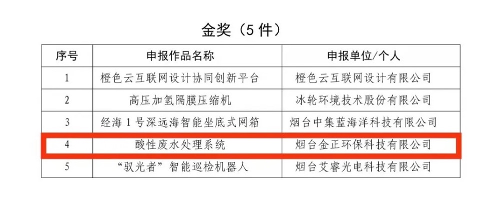 祝賀!煙臺(tái)金正環(huán)保酸性廢水處理系統(tǒng)榮獲金獎(jiǎng)!