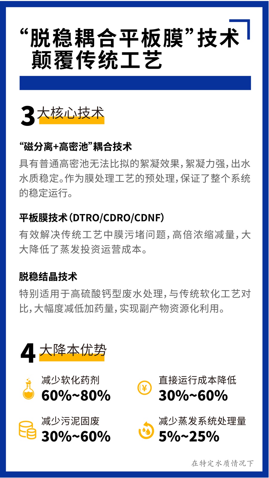 在某些工況下,采用“脫穩(wěn)耦合平板膜”技術,減少加藥量,以更短的流程實現(xiàn)化工廢水的零排放,處理成本降低20%~30%。